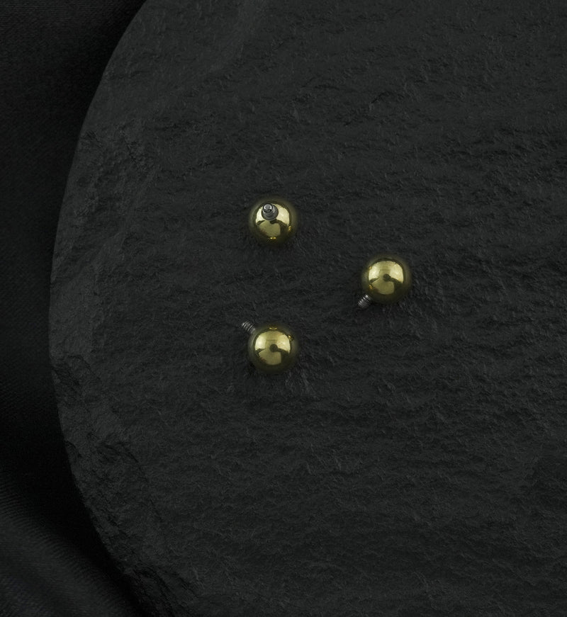 Accessorize with these golden, replacement titanium ball tops! Sold individually and available in size 14G with a 5mm ball size. These fit both 14G and 12G internally threaded posts. These internally threaded balls are 24kt gold pvd on ASTM F-136 Titanium, ensuring durability and an enduring style. Cool choice for internally threaded straight, curved, or circular barbells!