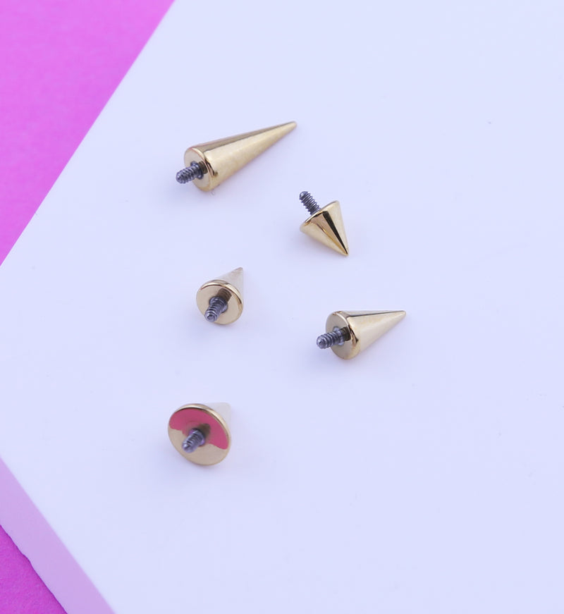 Accessorize with these golden, replacement titanium spikes! Sold individually and available in size 16G with a variety of spike sizes, these internally threaded spikes are 24kt gold pvd on ASTM F-136 Titanium, ensuring durability and an enduring style. Edgy choice for internally threaded straight, curved, or circular barbells! In the menu, the measurements are (L x W) in mm.