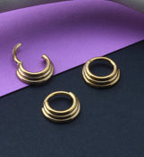 Triple layered hinged segment ring made from 24kt gold PVD on ASTM F-136 titanium. Hinge opens and clicks closed. Size 16G with an inner diameter of 5/16" (8mm). Sold individually. For healed piercings.