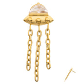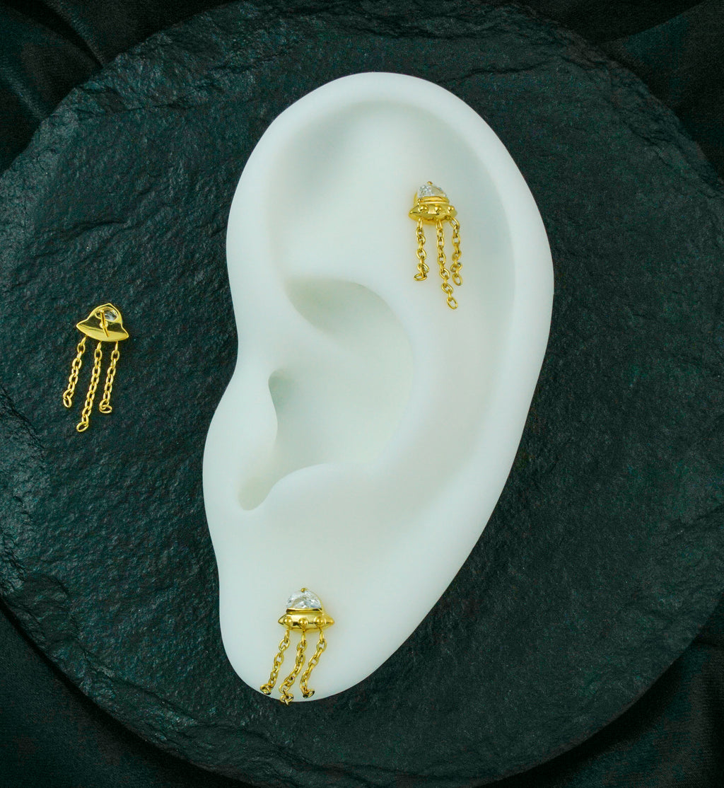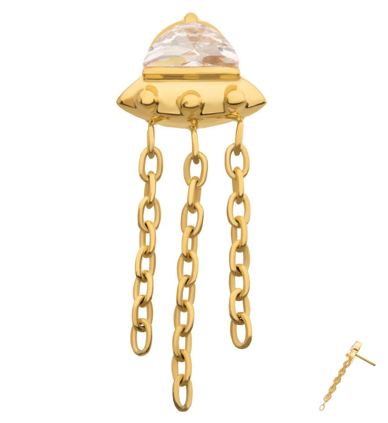 Golden top piece that is has extraterrestrial vibes! It is made with 24kt gold pvd on ASTM F-136 titanium and features a mini UFO shape that is accented with clear cz gems and has attached, dangling chains. This top measures 18mm x 6.5mm which includes the chain length. This piece fits most threadless posts and is a great choice for a variety of piercings! Sold individually.
