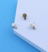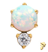 Golden, threadless top piece that has a lovely double gem design consisting of a 4mm, synthetic, white opal gem with an attached 2mm clear cz gem. Fits all threadless posts and is a sparkling option to add to your piercing. Made from 24kt gold pvd on ASTM F-136 titanium. Length is approximately 7mm and width is approximately 4.2mm. Sold individually (1pc, top only).