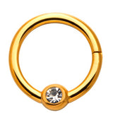 Classic hinged segment ring made from 24kt gold pvd on ASTM F-136 titanium with a single clear cz gem. Choose your size is 16G, 18G. Inner diameter size: 5/16" (8mm). The hinged design makes this piece easy to insert and remove. Sold individually (1pc). For healed piercings.