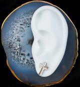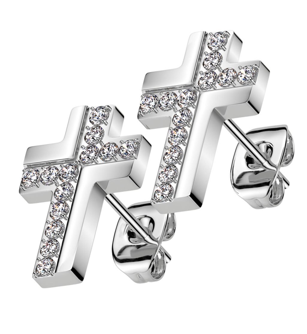 Stud earrings with a cross design top that has a row of clear cz gems along one side and across the center. Made with surgical 316L stainless steel. Size is 20G with a wearable length of about 1/4" (6mm). Each piece has a stud design with a butterfly back. Design measures about 14mm x 10mm. Sold in pairs (2pcs).