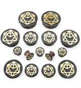 Handcrafted plugs made from areng wood with a alchemy symbol design on top, etched out of brass. Geometric pair to add to your plug collection! Each piece will be unique in color and pattern due to the nature of the wood. We will do our best to find you a matching pair. Available in sizes 00G (10mm) - 1 & 1/2" (38mm). Do not leave in direct sunlight or wear in extreme moisture conditions (like the shower). Brass is not meant for long term wear. It may oxidize in extreme moisture conditions. For healed piercings/lobes. Sold in pairs (2pcs).