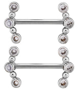 These Alternate Arch Clear CZ Stainless Steel Nipple Barbells are made from 316L stainless steel with alternating beads and clear cz gems in an arched design. Each barbell has a 9/16" (14mm) wearable area and is sized 14G. Externally threaded and meant for healed piercings. Sold in pairs (2pcs).