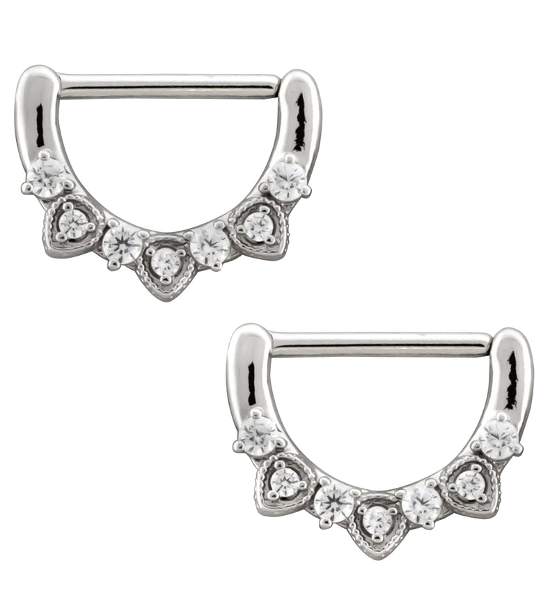 Made from 316L stainless steel, these nipple clickers feature a u-shape that is decorated with clear cz gems which are alternating in beaded outlines. These hinged clickers open and click closed. They have a 14G size and a comfortable 9/16" wearable area for healed piercings. Sold in pairs.