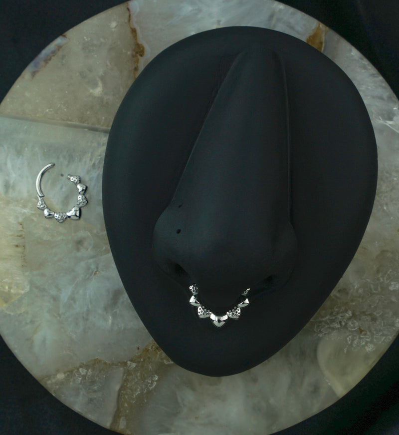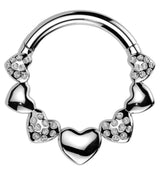 Lovely hinged segment ring with alternating steel and hammered heart designs. Made from surgical 316L stainless steel, this ring features a hinged segment for effortless opening and closing. Perfect for healed piercings, it's available in a size 16G with an inner diameter of 5/16" for a comfortable fit. Sold individually.