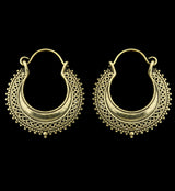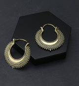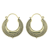 Lightweight yellow brass earrings/hangers with a curved, half moon design. Size is 18G. Measures at 40mm x 35mm. Weight is about 9.9 grams each. Made from brass. Not meant for long term wear. May oxidize under extreme moisture conditions. Sold in pairs (2pc). For healed piercings/lobes.