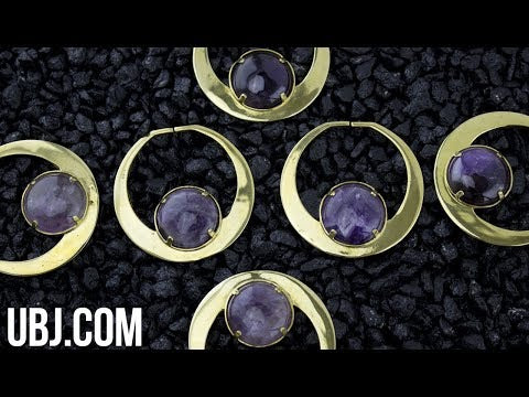 Sold in pairs (2pc) Size: Fit 2G eyelets and bigger Width: 45mm Height: 55mm 14 grams each Made from brass & amethyst stone Brass is not meant for long term wear May oxidize under extreme moisture conditions