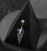 Beautiful belly button ring with a bezel set amethyst cz gem on top and an amethyst crystal as the bottom piece. Attached is a chain of prong set amethyst cz gems and beaded accent chains on either side. Size is 14G with a 3/8" (10mm) barbell. It is made from 316L stainless steel. Externally threaded. Top gem measures at about 5mm. Bottom gem is about 14mm x 6mm. Total length is about 50mm. Bottom chain design length: 30mm. Sold individually (1 pc). Recommended for healed piercings.