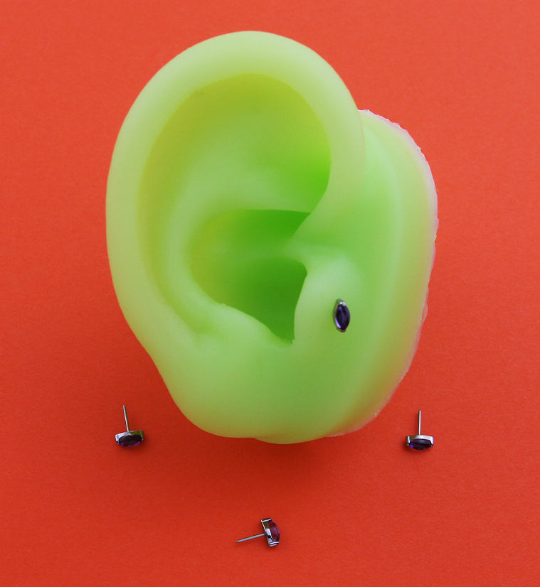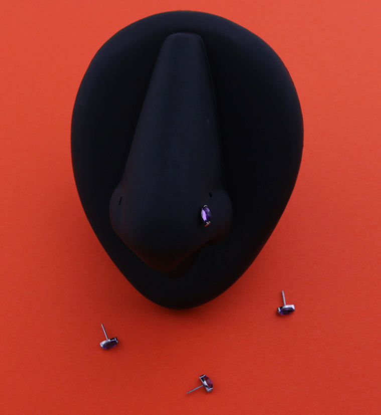 This titanium top is sold individually and made from the highest quality ASTM F-136 titanium. The top is made from a marquise shaped natural amethyst stone. Top measures about 5mm in size. Top is designed to fit most threadless posts with a 25G pin. Natural stone style to add to your piercing!
