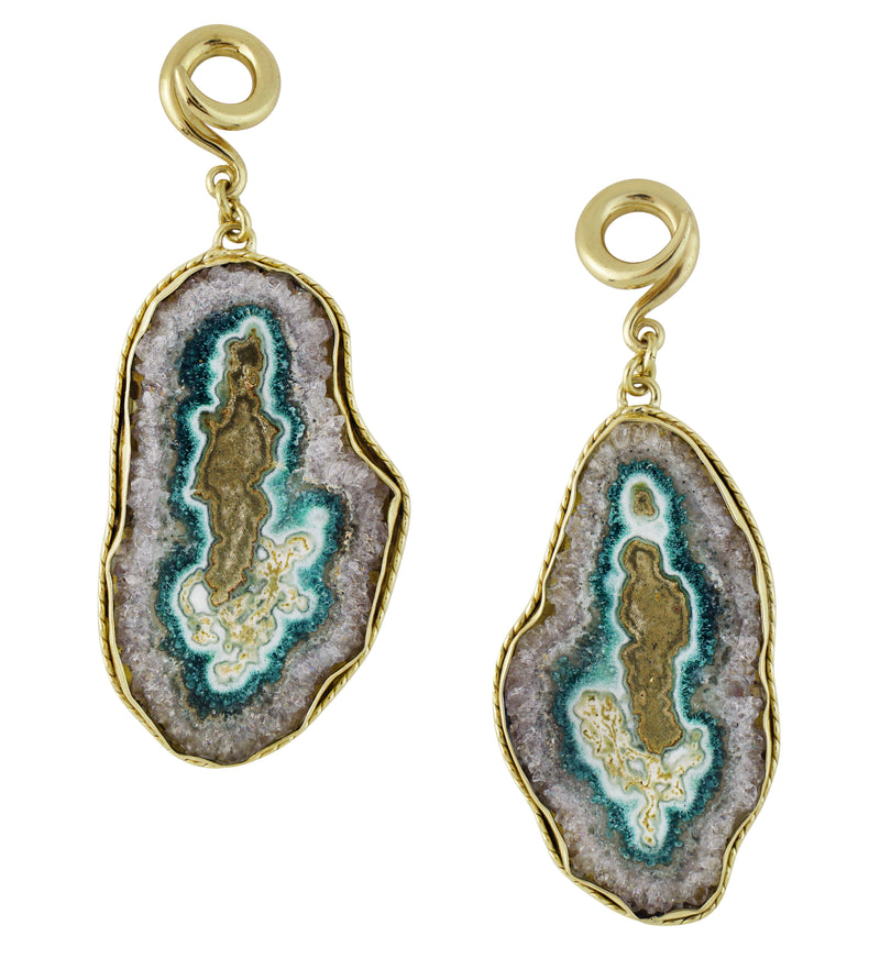 Handcrafted from raw amethyst, these brass ear weights are perfect for stretching your lobes to 2G (6mm) or larger. Each unique pair features an approximately 75mm x 42mm stalactite with a thickness of 10mm and a weight of 40-45 grams. While not suitable for long term wear, these weights add a touch of nature to your stretched lobes.