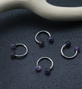316L stainless steel circular barbell with two natural internally threaded amethyst stone balls. Size 16G with an inner diameter of 3/8" (10mm). Add a natural element to your piercing collection. For healed piercings.