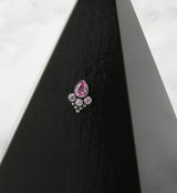 Threadless top piece made up of a pink teardrop cz gem and three round pink cz gems with a beaded accent. This piece is made from ASTM F136 titanium. Approximately 7mm length. Pin length is 5mm. Sold individually.