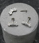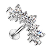 Gorgeous threadless labret piece that has a tiara or crown-like design and is filled with clear, marquise cubic zirconia gems. Made from ASTM F-136 titanium. Measures about 13.3mm x 7mm. Size is 18G. Choose your length from 1/4" (6mm) and 5/16" (8mm). 4mm flat back. Sold individually (top piece only).