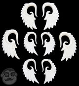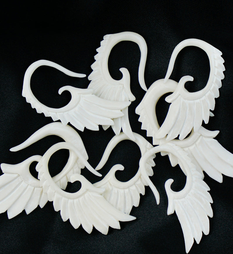 These Angel Wing Bone Hangers are made with sustainable water buffalo bone, sold in pairs, and available in sizes ranging from 12G (2mm) to 0G (8mm). Each pair is handmade with care. Also available in fake gauge which is 18G and has a push pin design that is made from ASTM F-136 titanium.