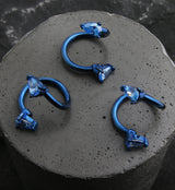 Twisted stainless steel barbell with two externally threaded teardrop aqua cz gems on each end. Made from 316L stainless steel with blue PVD plating. Sold individually (1pc). For healed piercings.