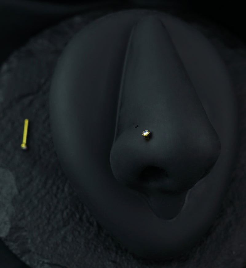 Sparkle with style! This anodized gold titanium nosebone features a dazzling rainbow aurora cz gem that catches light from every angle. Available in 20G (1.5mm CZ) or 18G (2mm CZ) with a comfy 8mm wearable length. Made from premium ASTM F136 titanium, it's the perfect pop of color for your nostril piercing. Sold individually.