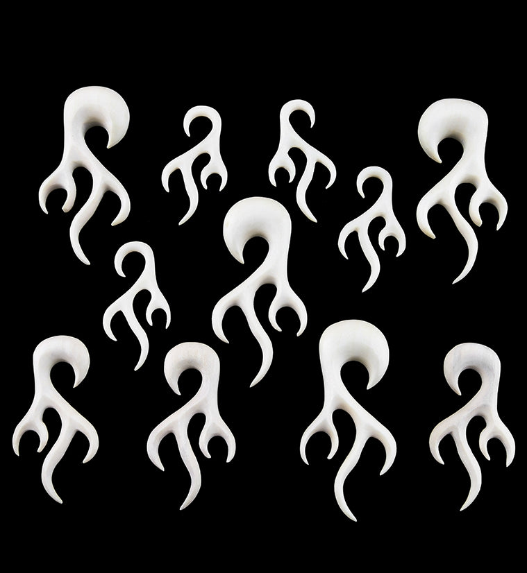 These Antler Wooden Hangers are handmade from unique crocodile wood. Sold in pairs, each set has its own one-of-a-kind pattern and color. Available in sizes from 8G (3.2mm) to 5/8" (16mm), these beauties are designed for healed lobes only, they are not meant for ear stretching. Because they’re handmade, sizing may vary slightly. Keep them away from direct sunlight and moisture to keep their natural charm shining bright.