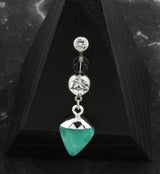 This navel piercing is crafted with a 316L stainless steel 14G barbell with a 5mm clear cz gem top and a 8mm clear cz gem bottom. Attached is a 12mm x 14mm dangling, triangle-shaped, green jade stone. Size is 14G with a 3/8" (10mm) barbell. Externally threaded, this navel barbell is designed for healed piercings. Sold individually (1pc).