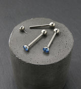 Classic threadless barbell with light blue bezel set cubic zirconia gem top that measures at 5mm. Made from ASTM f-136 Titanium. Size is 14G. Length is 5/8" (16mm). Threadless design. Sold individually (1pc).