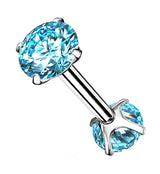 Dazzle ‘em with our double aqua CZ barbell! The 16g straight barbell features 316L stainless steel construction, 5/16" wearable area and internal threading for a reliable fit. Aqua cubic zirconia ends are set with prongs and measure 3mm total. Designed for healed piercings only.
