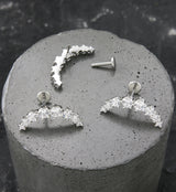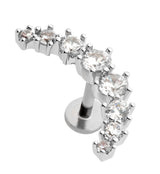 Threadless labret that consists of an arched design that is filled with round clear cz gems. Made from 316L stainless steel. Size is 18G with a 1/4" (6mm) length. 4mm flat back. Top design measures at 18mm x 3mm. Sold individually (1pc).