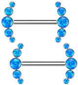 Titanium threadless nipple ring barbells with an arched design on either side consisting of five bezel set, synthetic blue opal gems. Made with hypoallergenic ASTM F-136 titanium. Featuring a 14g straight barbell and 9/16” (14mm) barbell length. Gem design measures about 14mm x 4mm. Sold as a pair (2pcs).