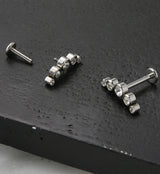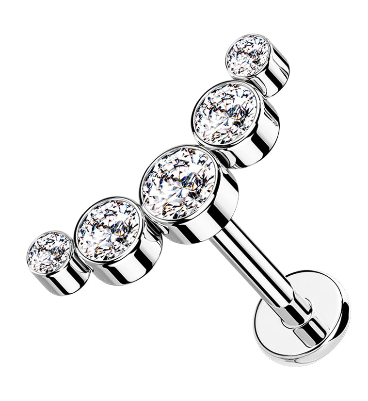 Labret post made from 316L stainless steel with an arch of sparkling, clear cz gems. Size is 16G with an inner length of either 1/4" (6mm) or 5/16" (8mm). 3mm disk size. Top is approximately 12mm. Internally threaded. Sold individually (1pc). For healed piercings.