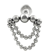 Internally threaded labret with arched, beaded design on top with attached, double, dangling beaded chains. Made with 316L stainless steel with sizes 18G and 16G to choose from and post lengths of 1/4" (6mm) and 5/16" (8mm). Both size have a disk size of 4mm. The full design (including dangling chains) measures about 11mm x 10mm. Labret is internally threaded and intended for healed piercings. Sold individually.
