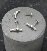 Internally threaded labret that consists of clear cz gems in the shape of the constellation of the Aries zodiac. Pin and base are made from 316L stainless steel and the constellation design is made from rhodium plated brass so it may tarnish over time if exposed to extreme moisture conditions. Choose your gauge size between 18G and 16g. Length is 5/16" (8mm). Constellation size is 14mm x 2mm. Flat back: 4mm. For healed piercings. Sold individually (1pc).