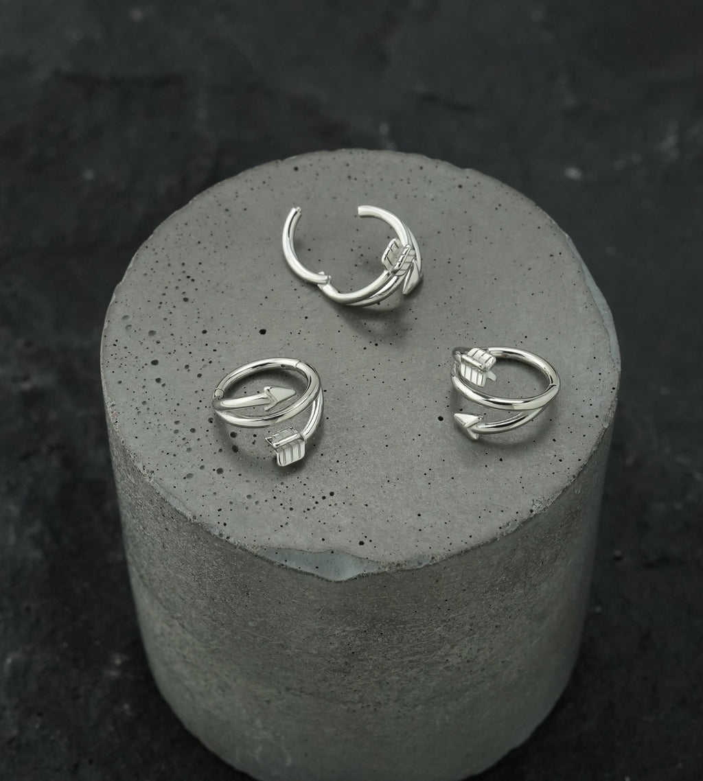 Hinged segment ring made from 316L stainless steel with hoop shape that has a twisted arrow design. Size is 16G. Inner diameter size is 5/16" (8mm). The hinged design makes this piece easy to insert and remove. Sold individually (1pc).