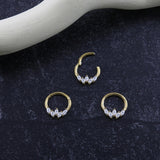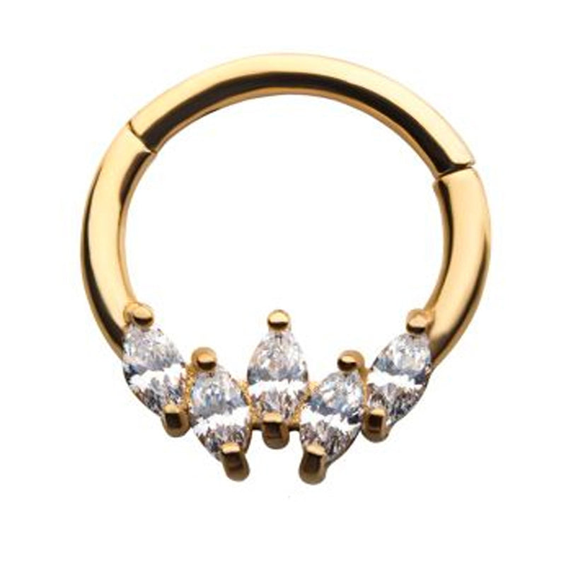 The Gold PVD Auroral CZ Hinged Segment Ring is the ideal addition to your collection. Made with gold pvd on 316L stainless steel, this ring is both durable and stylish. The clear CZ gems add a touch of elegance, while the hinge design makes it easy to open and close. Ideal for healed piercings, this versatile piece is great for septum or cartilage piercings. Sold individually (1pc).