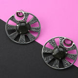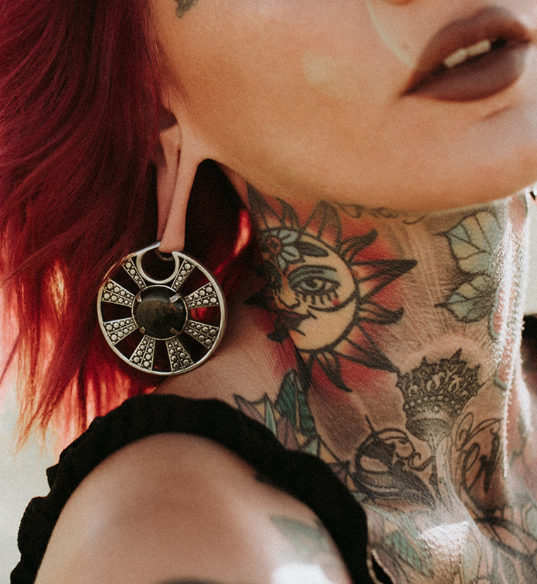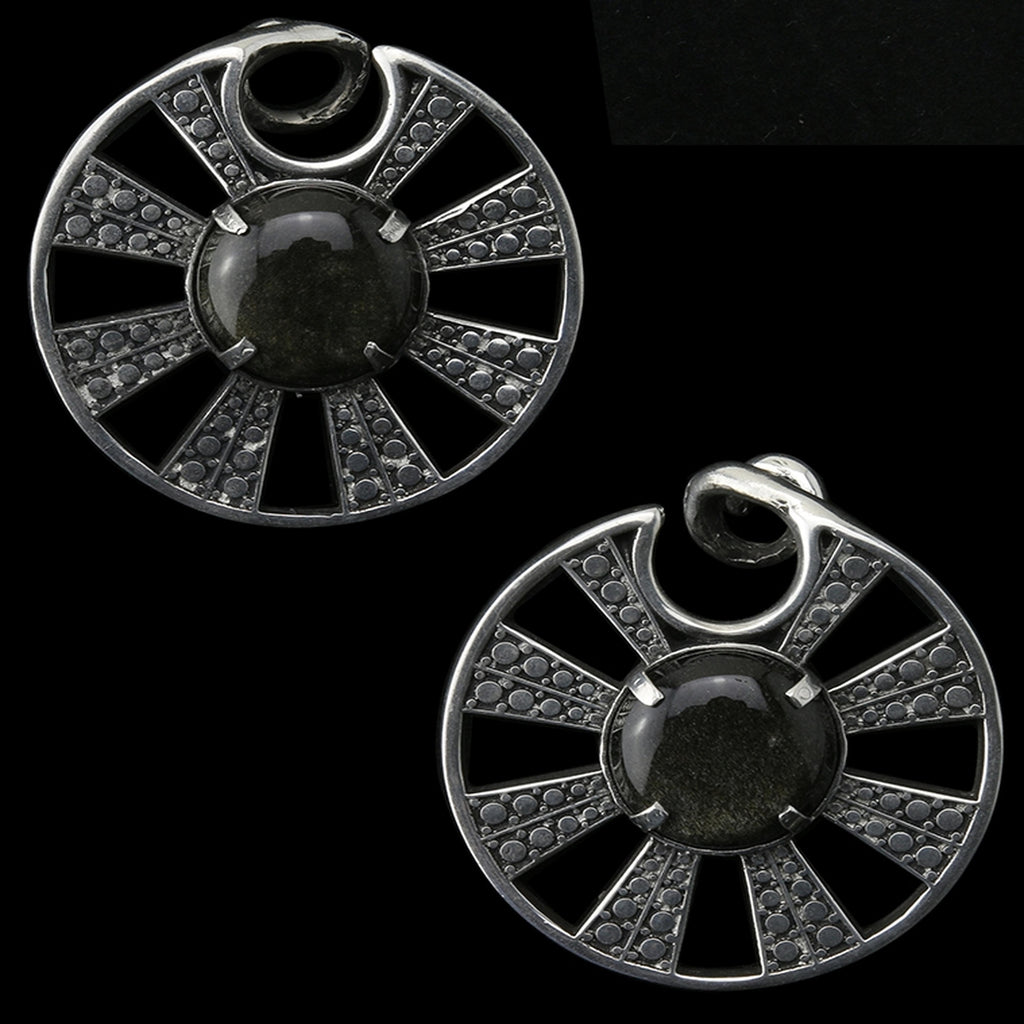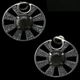 White brass ear weights with a wheel design and a centered golden obsidian stone gem. Width is 48mm x 50mm. Must be 2G(6mm) or bigger to wear. They weigh about 28 grams each. Made from white brass. Brass is not meant for long term wear. It may oxidize under extreme moisture conditions. Sold in pairs (2pcs).