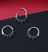 Hinged segment ring made from 316L stainless steel with a spiked, studded design. Hinged style makes for easy opening and closing. Size 16G. Diameter size: 5/16" (8mm). Sold individually. For healed piercings.