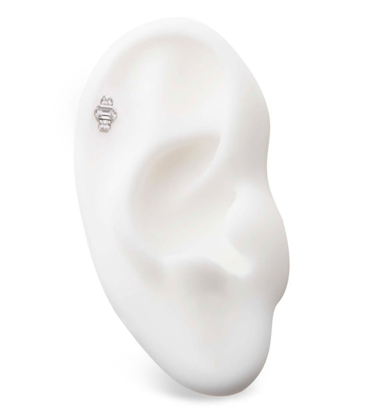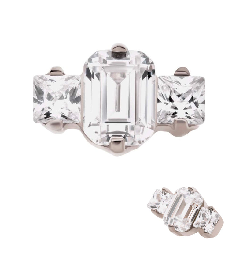 Regal threadless top piece that has 2 clear, square cz gems on either side of an emerald-cut cz gem. Made from ASTM F-136 titanium. Measures about 7.3mm x 4.5mm. 25G pin. Fits most threadless posts. Sold individually (top piece only).