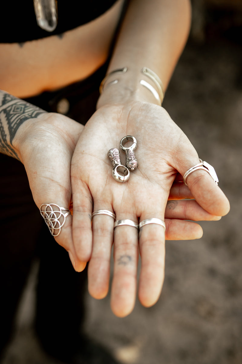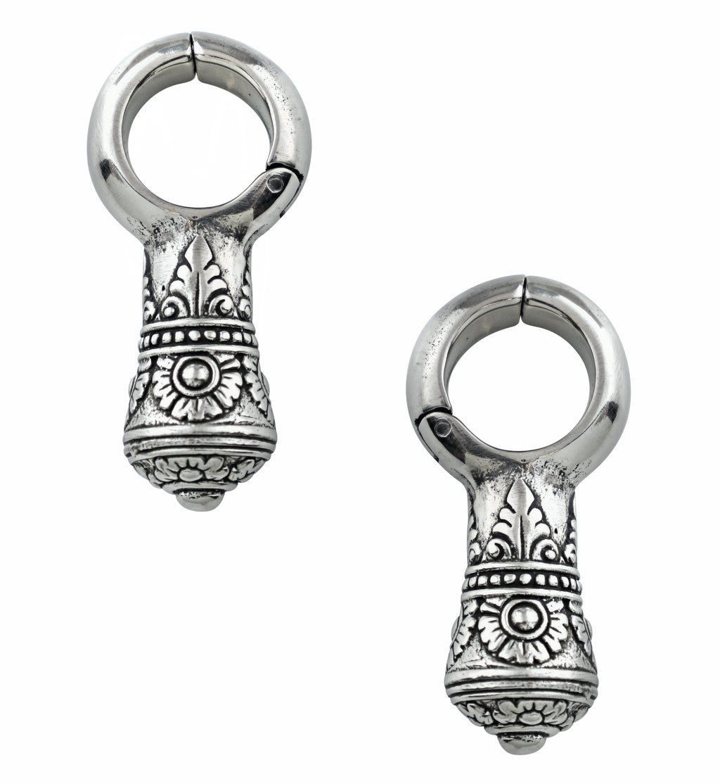 Hinged ear weights that are created from white brass and are size 0G (8mm) so must be 0G or bigger to wear. They have a dropped, cylinder design that is ornately decorated with swirls and flowers. Brass is not meant for long term wear, as it may oxidize under extreme moisture conditions. These ear weights have a hinged design that opens and clicks closed. Length measures at 35mm. For healed lobes. Sold in pairs.
