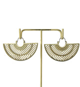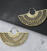 Golden brass hangers/earrings with an intricate design. Size is 18G with measurements of 56mm x 38mm. Each earring weighs about 17 grams. Made from brass with a ASTM F-136 titanium clasp. Sold in pairs (2 pieces).