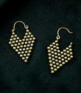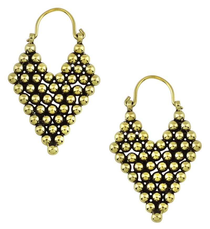 Beaded earrings that are made from brass and have a pointed, triangle design that is decorated with beads. They are size 18G (1mm) so must be 18G or bigger to wear. Brass is not meant for long term wear as it may oxidize under extreme moisture conditions. These have a hinged design that easily opens and clicks closed. Full size is about 40mm x 25mm and they weigh about 4.25 grams each. For healed lobes. Sold in pairs (2pcs).