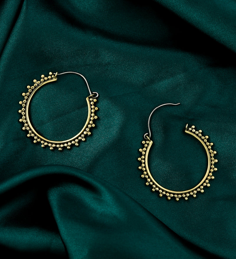 Our 18G Beaded Brass Hangers are sure to add a touch of fun to your ear game! Made from yellow brass and 18G ASTM F-136 titanium wire, these hangers come in pairs and measure 44mm in width and 48mm in height. Just be sure to avoid extreme moisture, as brass may oxidize. Note: Not meant for long term wear.
