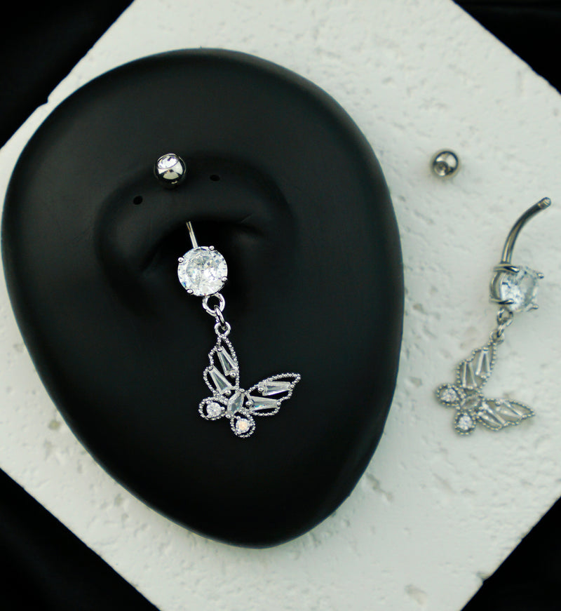 Striking belly button ring has a dangling butterfly design that has a beaded outing and has pointed baguette clear cz gems along with two round clear cz gems and an oval cz gem throughout. The belly ring has a wearable length of 3/8" (10mm) and a gauge size of 14G. Made from 316L stainless steel. It has a 5mm externally threaded ball top with a 4mm clear cz inside and a prong set, 7mm clear cz gem bottom. For healed piercings. Sold individually.