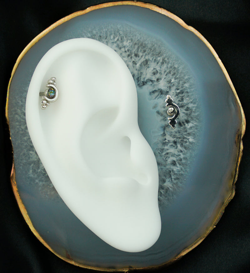 Striking stainless steel cartilage/tragus barbell with a crescent moon design that is accented with a centered, 4mm bezel-set, black rainbow aurora cz gem and three beads on each side. It is made from shiny 316L stainless steel and is externally threaded. Sparkly option for your cartilage piercings! Size is 16G with a bar length of 1/4" (6mm) with a 2.5mm externally threaded ball. Top size is 12mm x 5mm. Sold individually. For healed piercings.