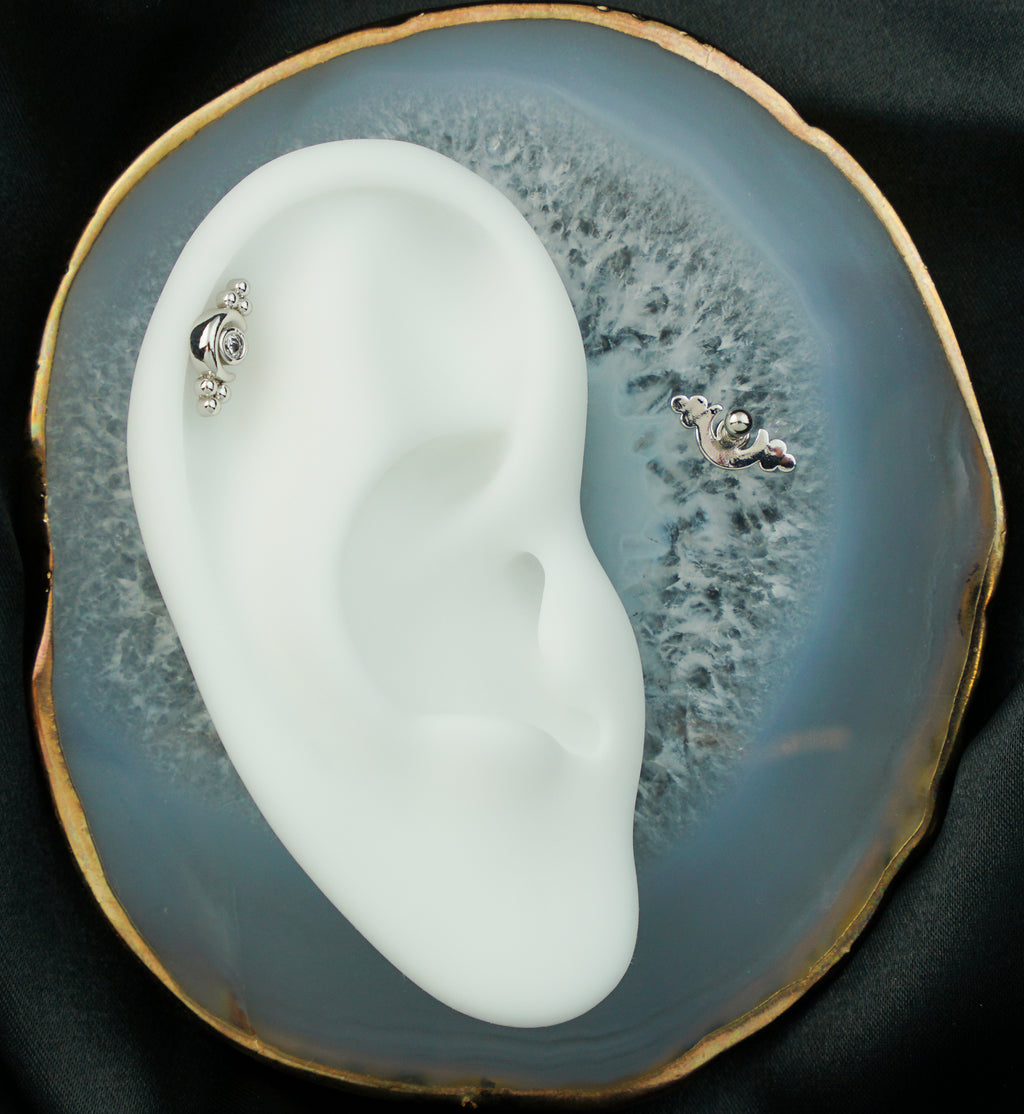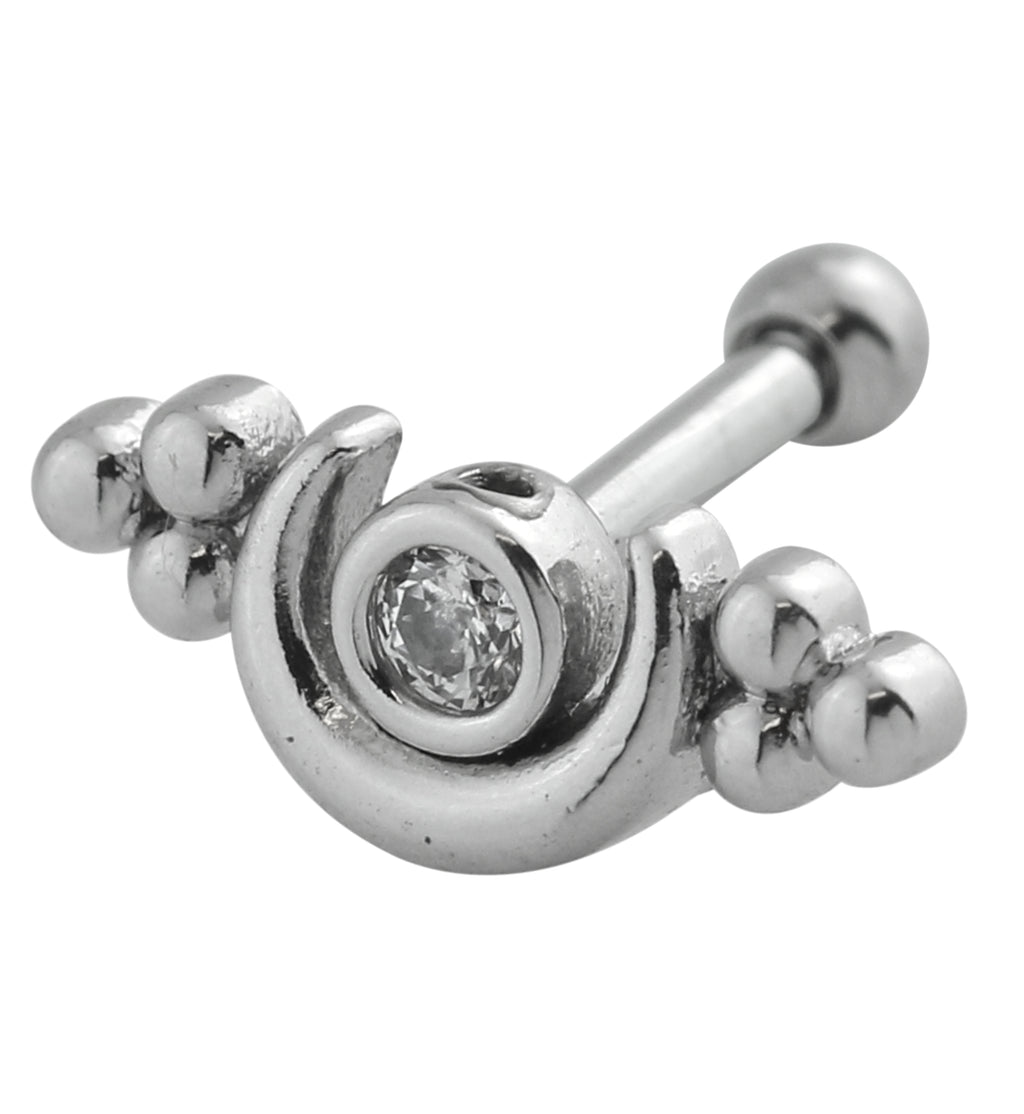 Beautiful stainless steel cartilage/tragus barbell with a crescent moon design that is accented with a centered, 4mm bezel-set, clear cz gem and three beads on each side. It is made from 316L stainless steel and is externally threaded. Sparkly option for your cartilage piercings! Size is 16G with a bar length of 1/4" (6mm) with a 2.5mm externally threaded ball. Top size is 12mm x 5mm. Sold individually. For healed piercings.