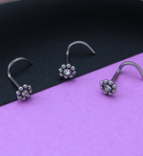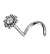 Nose screw ring with beaded floral design around a clear cz gem. It has a 1/4" (6mm) length 316L stainless steel screw ring design. Choose your size: 20G & 18G. Easy to insert and take out. Sold individually. For healed piercings.