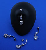 This belly button ring is a sparkling piece to add to your collection! Crafted with 316L stainless steel and featuring a dangling beaded heart design attached to an upside down teardrop shaped, beaded clear cz gem. This piece is designed to fit healed navel piercings and measuring 14G with a 3/8” (10mm) barbell length. The top gem measures 5mm in size, the bottom gem measures 7mm in size. The bottom dangle design measures 11mm x 9mm.