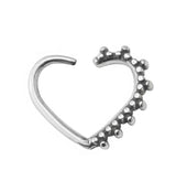 Pretty heart shaped seamless hoop ring made from 316L stainless steel and with a beaded design on one side. Bendable. Inner diameter is 10mm x 9mm. Size 16G. Sold individually. For healed piercings.