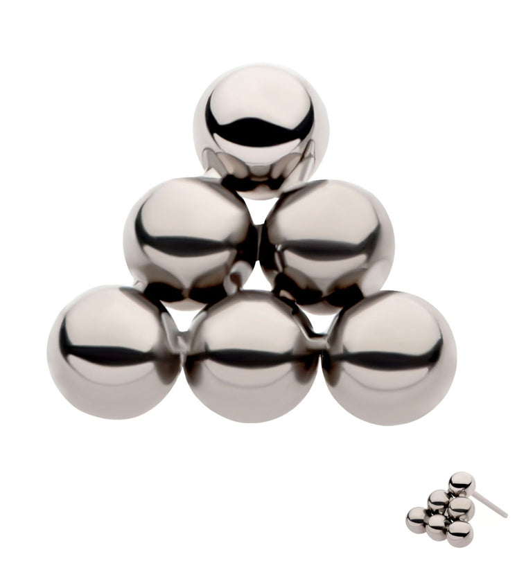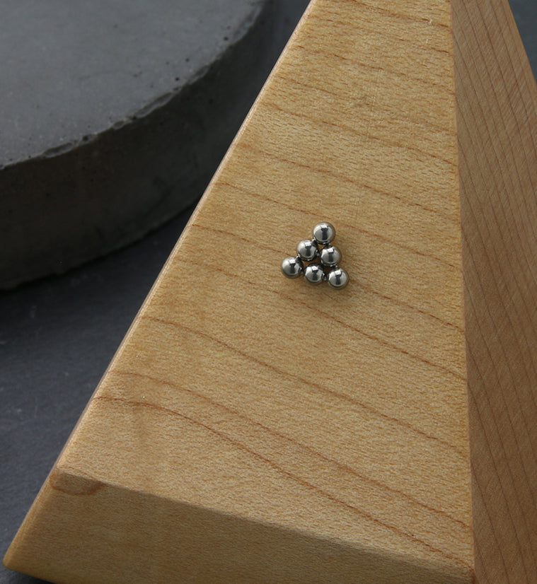 Threadless top piece that has a beaded triangle or pyramid design made up of 6 beads measuring about 2mm each. Made from ASTM F-136 titanium. Measures about 6mm x 5.5mm. Fits most threadless posts. Pin length is 5mm. Sold individually (top piece only).