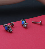 Beaded threadless labret with a synthetic blue opalite surrounded by clear cz gems on the end. Size is 16G with a 4mm flat back piece. Made from ASTM F-136 titanium. Choose your length from the menu between 1/4" (6mm) and 5/16" (8mm). Sold individually (1 pc).