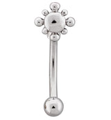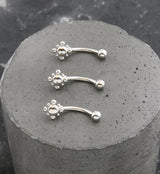 Curved barbell with a round design on top that has beaded accents surrounding it. Cool piece for your daith or eyebrow piercing! Made from 316L stainless steel and is 16G. Length is 5/16" (8mm). Externally threaded. Intended for healed piercings. Sold individually (1pc).