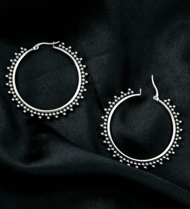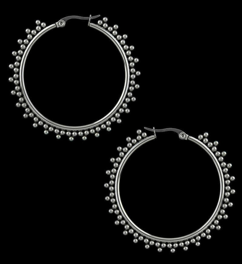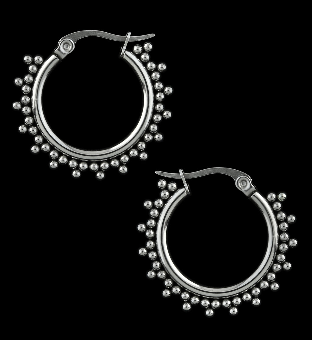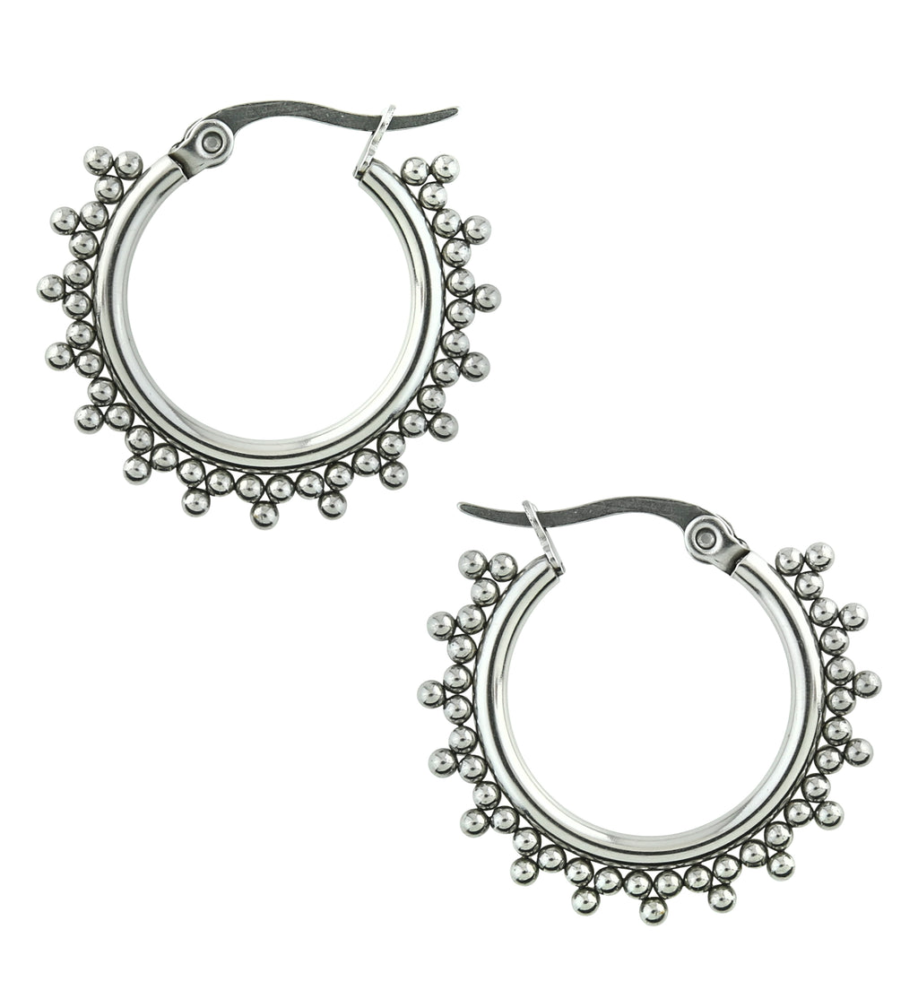 Playful and unique, our 18G Beaded Stainless Steel Hangers are sure to add a touch of fun to your lobes! Made from 316L stainless steel, these hangers come in pairs and two sizes. The small size measures about 26mm x 24mm and the large size measures about 48mm x 48mm. They have a hinged closure, making this pair easy to put in and take out. Sold in pairs.